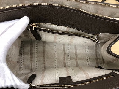 まずはバックで一番負荷が掛かりやすいハンドルやショルダーストラップの状態を確認します。シワが入っていたり、革の縫い目がほつれていれば減額になりますが、今回はそのようなダメージは見られませんでした。