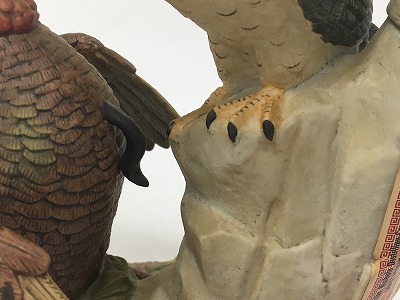 羽根や嘴など装飾に欠けやキズなどは見られませんでしたが、経年によるものか保管状況によるものか変色がかなり見られましたので、減額対象となっています。