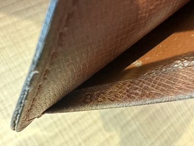 通気性のあまり良くない場所で長期保管されるとこういった部分の革が溶けて剥がれが見られる場合があります。