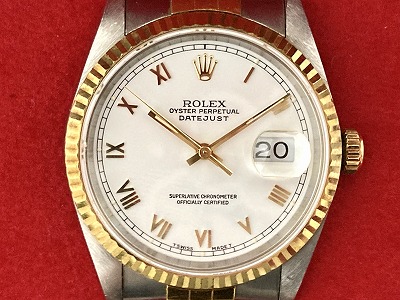 世界的に有名なスイスの高級腕時計メーカー、ROLEX(ロレックス)が生み出した数ある時計の中から【デイトジャスト16233 ホワイトローマン】をお持ちいただきました。