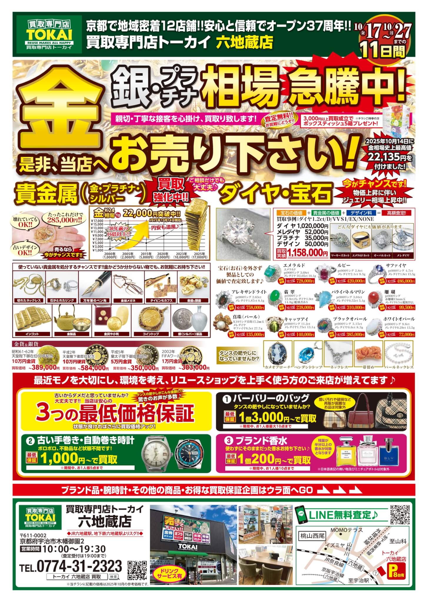 チケット&ブランドリサイクルトーカイ 六地蔵店の入江です。