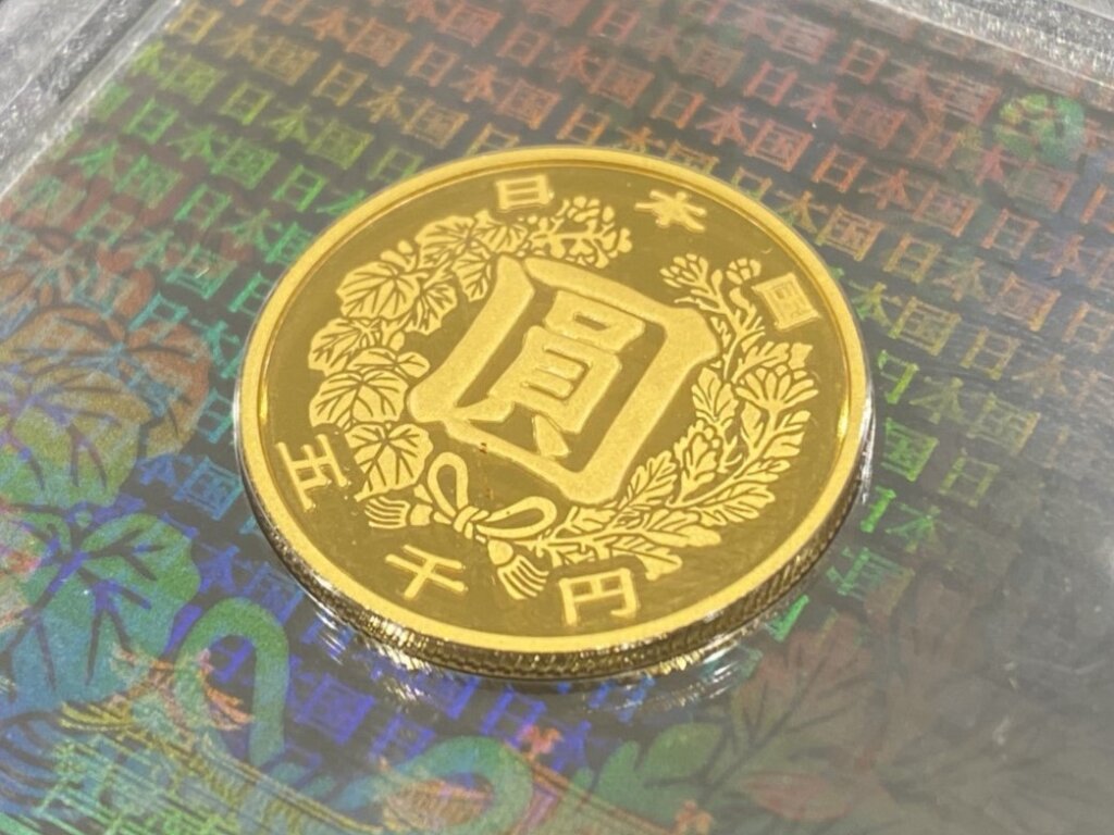 今回お持ち込みいただいた五千円金貨幣の他に、一万円金貨幣(K24、重量15.6g、直径26mm、発行枚数20,000枚)と千円銀貨幣(SV1000、重量31.1g、直径40mm、発行枚数50,000枚)が存在します。