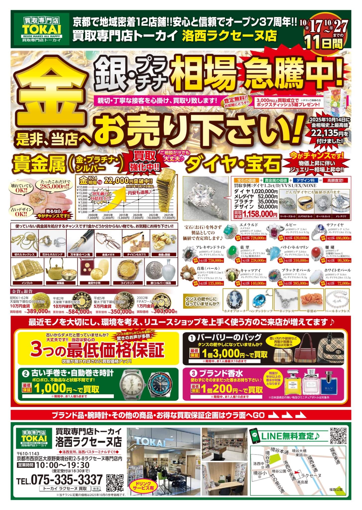 【洛西ラクセーヌ店新着】10/17折込チラシ『金・銀・プラチナ相場急騰中!!高価買取祭』開催中です!