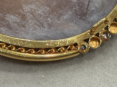 K18の金枠に総カラット0.29のダイヤモンドがあしらわれた、カメオ付きブローチをお持ち込みいただきました。