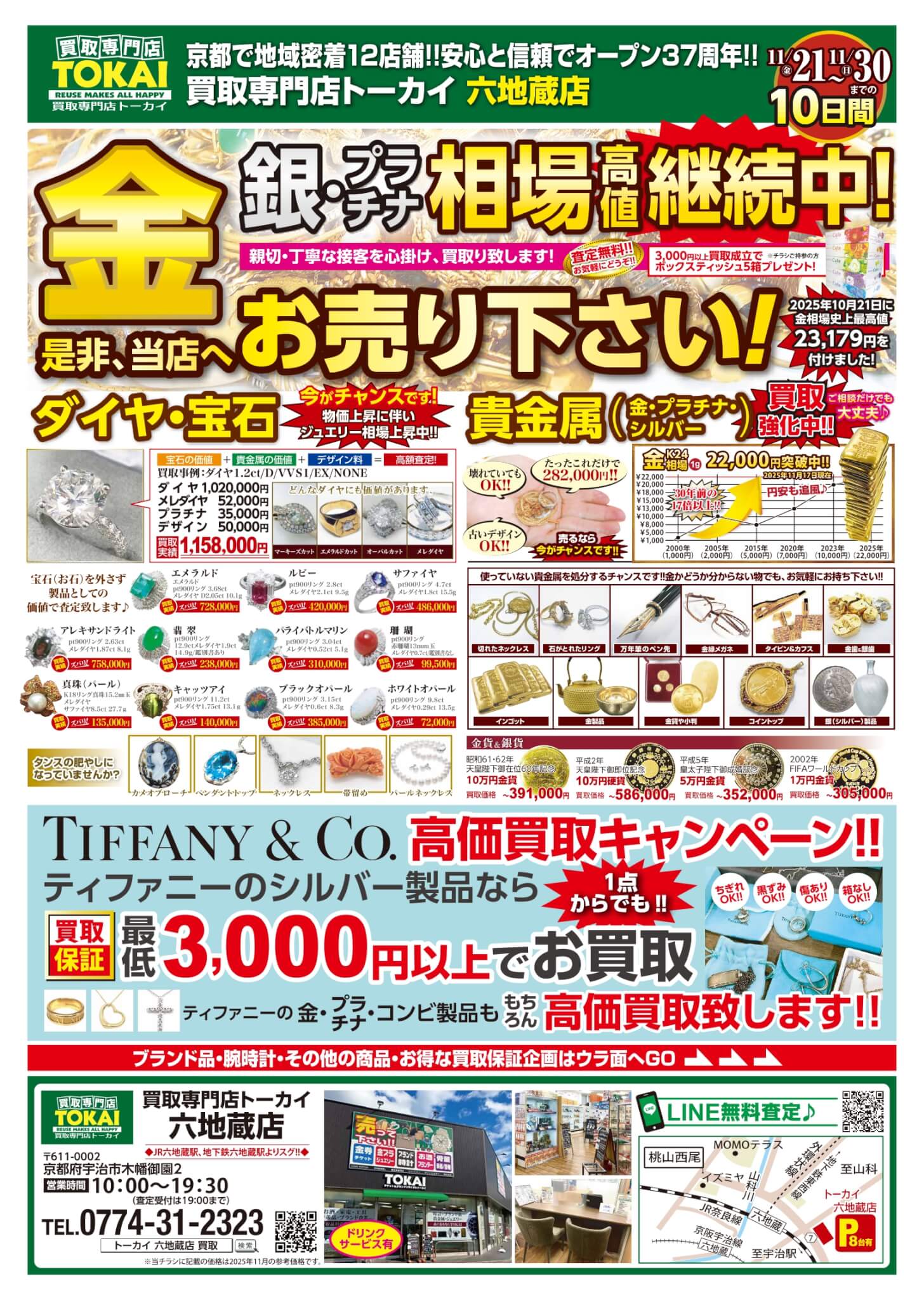【六地蔵店新着】11/21折込チラシ『金・銀・プラチナ相場高値継続中!!高価買取祭』開催中です!