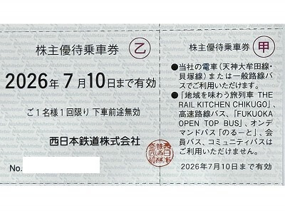 【西日本鉄道株主優待券】は、西日本鉄道株式会社(証券コード:9031)から毎年3月末・9月末日時点の株主様へ保有株数に応じて謹呈される優待券です。