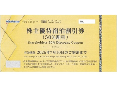 株主優待専用ホームページで販売中のプラン1泊1室朝食なしの室料(予約日時点での室料)が50%割引になる割引券です。