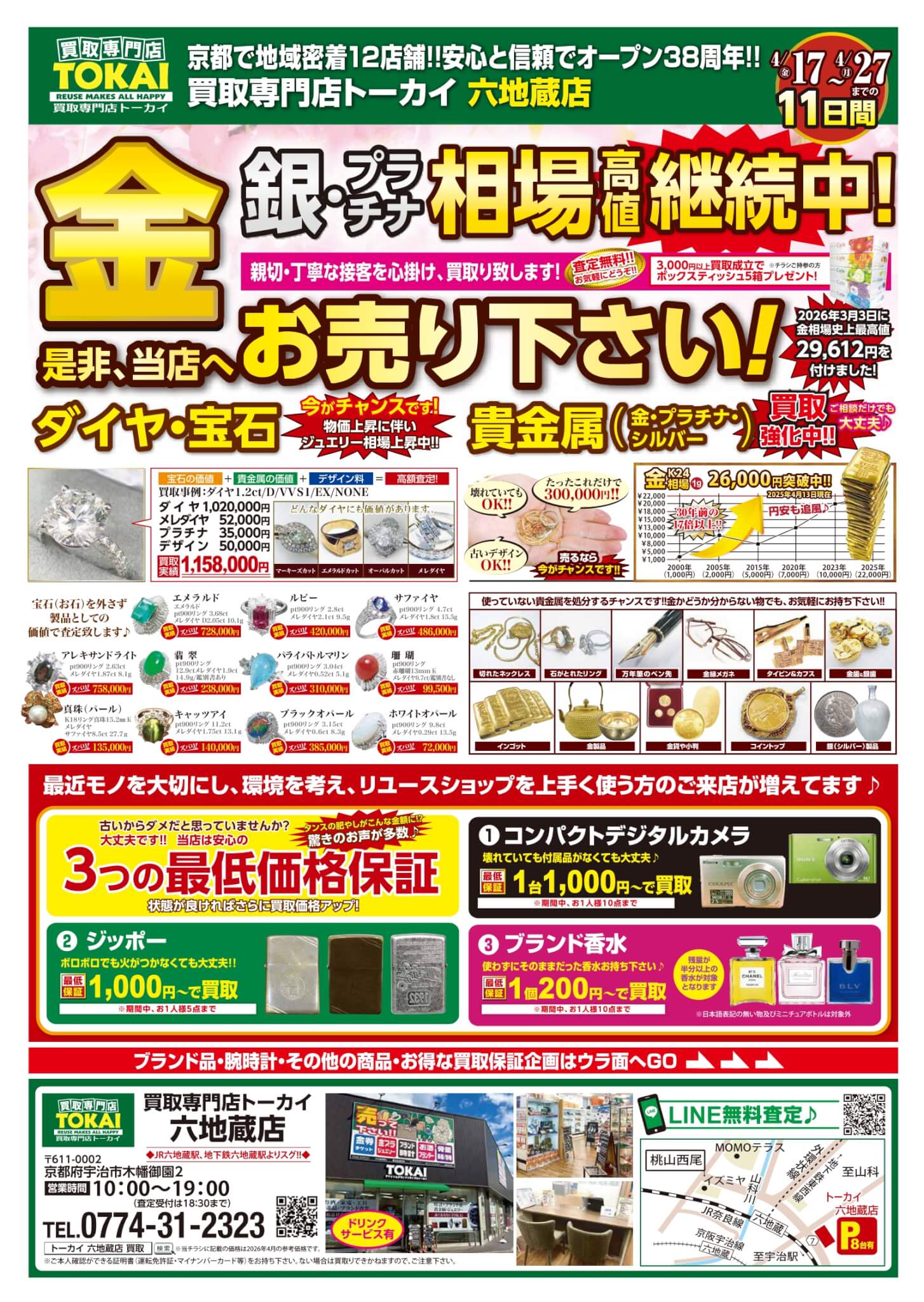 【六地蔵店新着】4/17折込チラシ『金・銀・プラチナ相場高値継続中!!高価買取祭』開催中です!