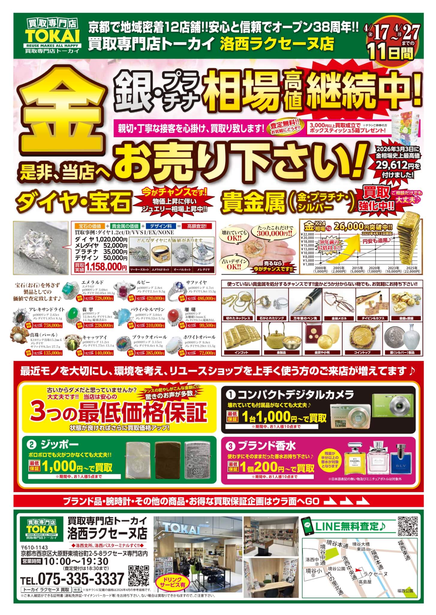 【洛西ラクセーヌ店新着】4/17折込チラシ『金・銀・プラチナ相場高値継続中!!高価買取祭』開催中です!