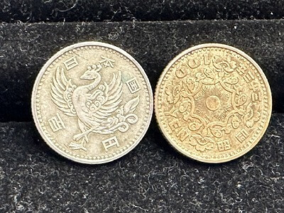表面に羽を広げた鳳凰の図柄および「日本国」と「百円」の文字、裏面には旭日を囲む4輪の桜の花の図柄と「100YEN」の文字、製造年が配されていて、硬貨では当時の最高額面でした。発行枚数は1億枚